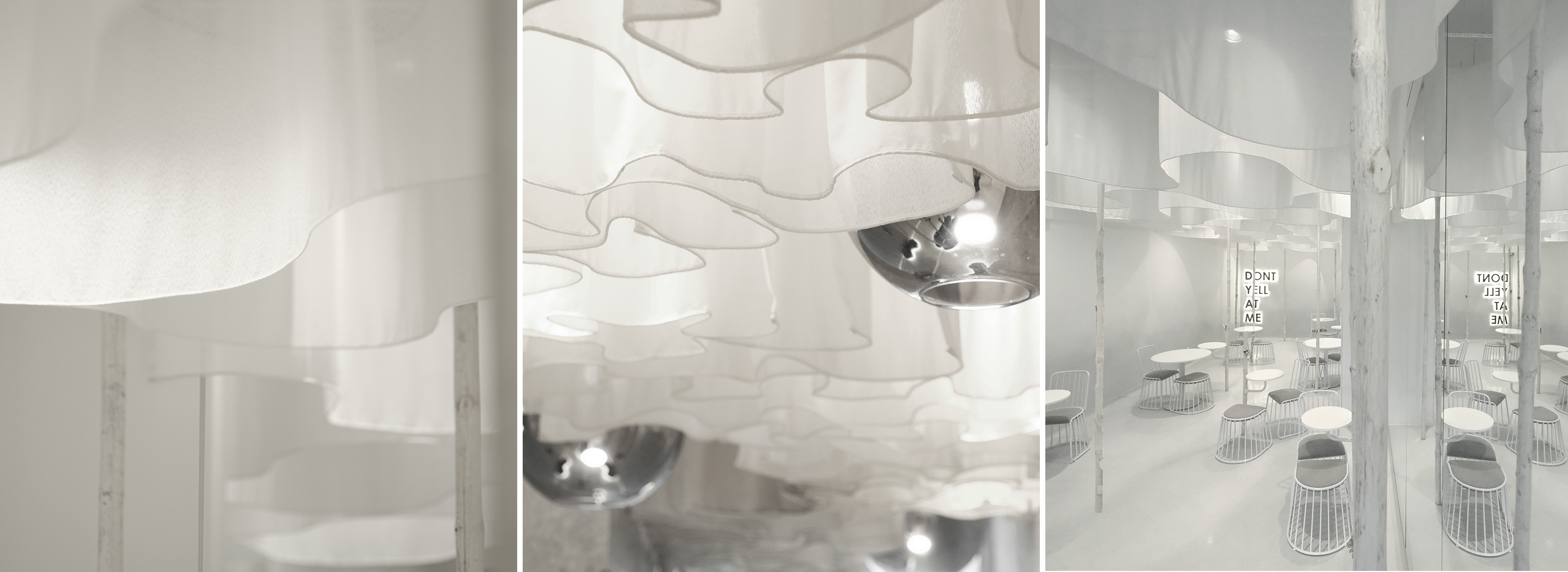 座椅随机的排法为空间打造了灵活的弯曲动线,人流随着动线就像穿梭在樹林之間。頂著輕淺漂浮的紗布,茶香貫穿人與人之間的交談。全白的色調中和了不同的元素把画面概念化,突顯茶對連繫人們關係的重要性。